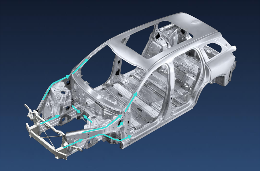 并将碰撞力向A柱跟门槛以及地面传递。而高强度的横梁有效抵御来自底盘以及乘员舱的侵入。