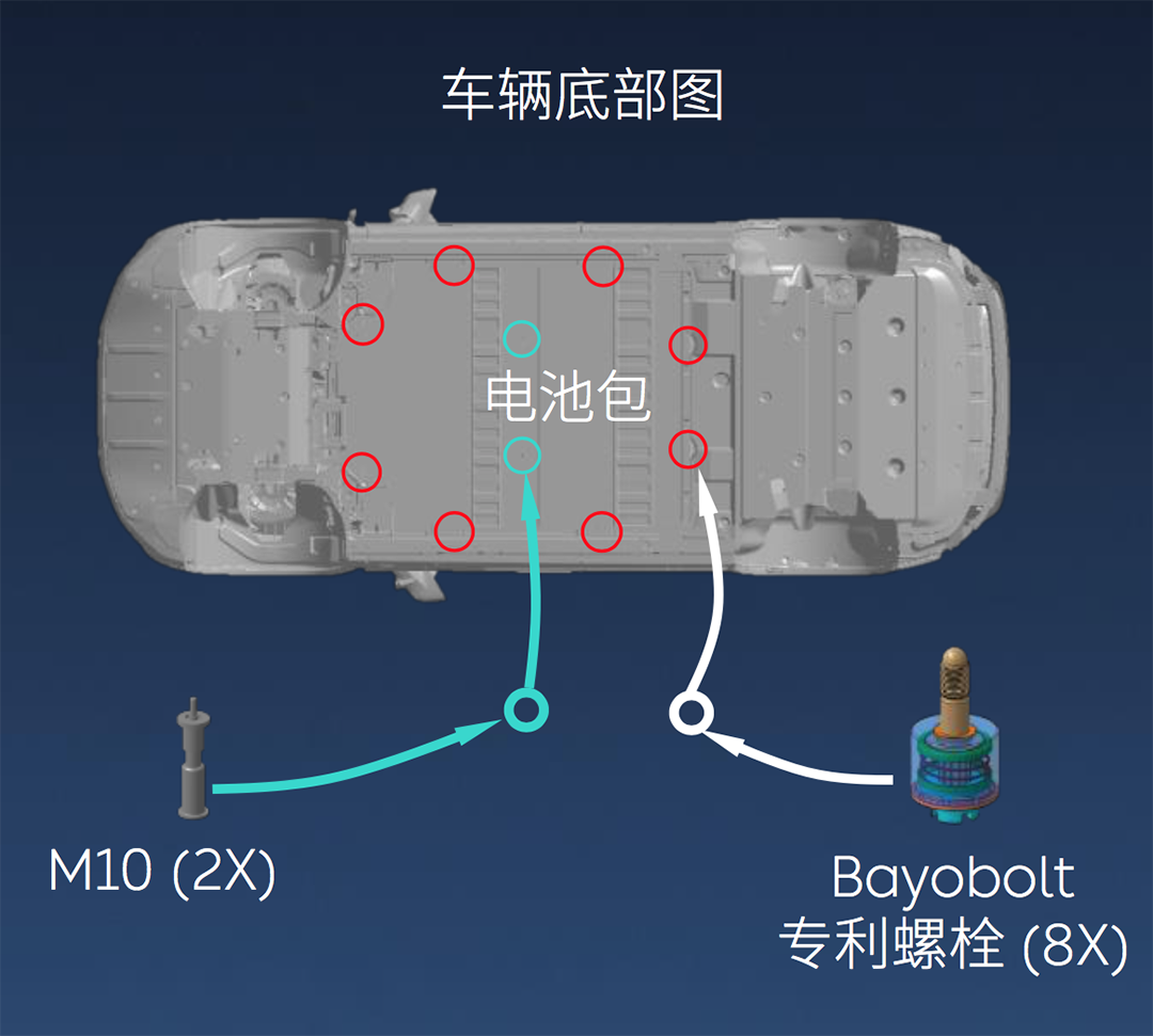而换电系统用M10螺栓和BayoBolt螺栓的紧固件,不仅做到换电过程的高效和步骤简化,也加强了电池包的安全。