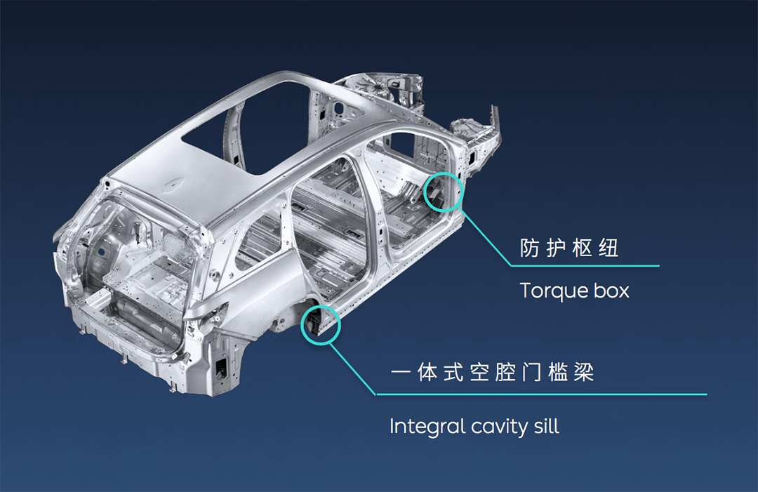 得益于门槛梁的一体式多腔门结构设计,以及6系铝材的3根冲压横梁+3根挤出横梁;