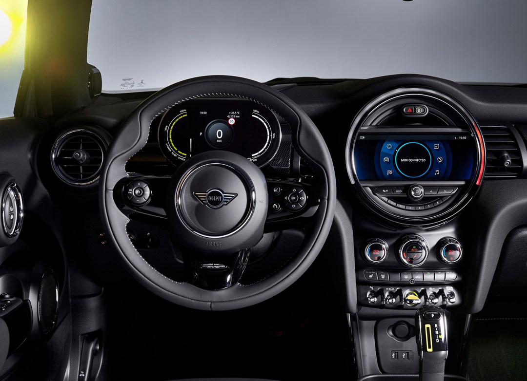 而MINI则跟外观一样保持原有经典造型,硕大的圆形中央显示屏设置在中央,周围还伴随有氛围灯,除了一键启动按钮以及副驾驶前方饰板处带有新能源标志性的绿色装饰以外,原本的指针式仪表盘也更换成全液晶仪表盘,其余并没有特别明显的变化。
