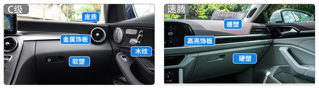 车内的差别才是最明显的。比较两车内饰的视觉效果,奔驰C级运用了比较多高档的材质,比如木纹装饰、金属饰板、皮革等等,设计层次比较丰富。而速腾的内饰相对来说比较简洁,仅仅是用了大面积搪塑材质铺装中控台,高亮饰板也没有特别出彩的地方。视觉上奔驰C级展现出来的豪华感要比速腾高太多了。