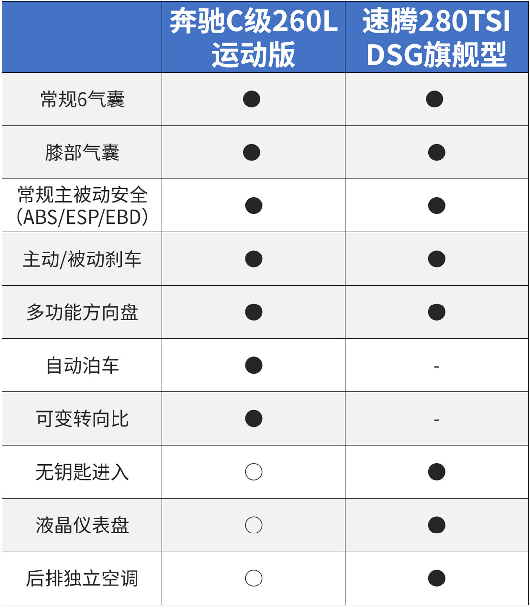 有人说配置上的差异应该是最明显的,奔驰C级肯定比速腾要丰富很多。事实上两车在配置上有着很多相同的地方,比如膝部气囊、主动刹车、倒车影像等等,一些该有的配置两车上都没有缺席,两车都属于配置丰富的车型。此外奔驰C级比速腾多了自动泊车、可变转向比两个比较高级的配置。而速腾比奔驰C级多了无钥匙进入(前排)、全液晶仪表盘、后排独立空调这几个实用配置。