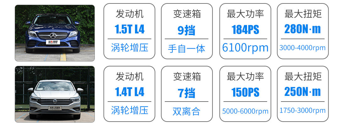 动力系统才是一辆车最“贵重”的地方,对比的这两辆车因为级别的不同,动力系统存在着明显的差异。奔驰C级搭载的是1.5T发动机,速腾搭载的是1.4T发动机,乍看之下差不多,但你看参数就能发现奔驰C马力达到了184匹,而速腾只为150匹,豪车的马力比买菜车高了不少。