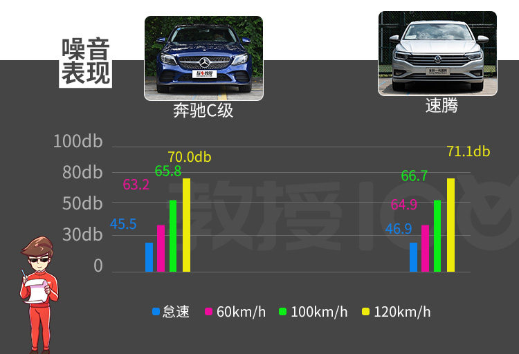我们可以通过实测噪音的数据来比较两车NVH的处理效果,奔驰C级在各个时速范围内噪音都要优于速腾。再加上座椅的柔软程度、悬架的柔软程度C级都要优于速腾,所以乘坐的舒适性自然也是C级胜出了。