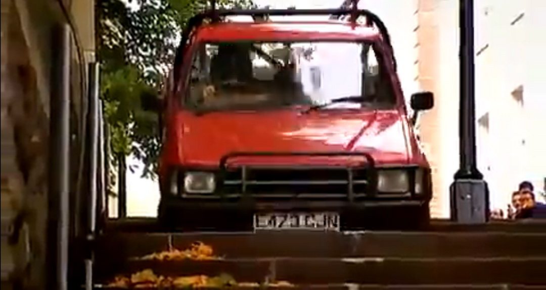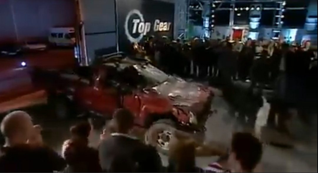 测试开始,主持人Jeremy Clarkson先来个开胃菜,下个楼梯,蹭个墙,撞棵树。