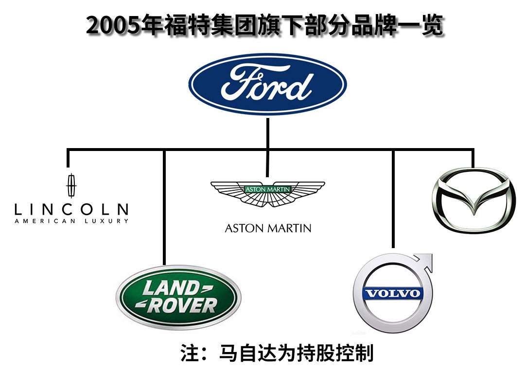 彼时,福特在世界上一时风头无两,不仅拥有福特、林肯等品牌,英国的阿斯顿·马丁、路虎、瑞典的沃尔沃都是福特集团的品牌,日本的马自达则为持股控制。