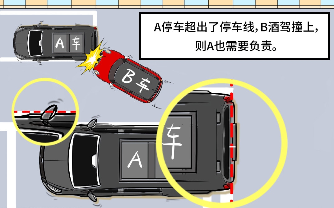 1. 上文提到的,A停车超出了停车线,B酒驾撞上,则A也需要负责。