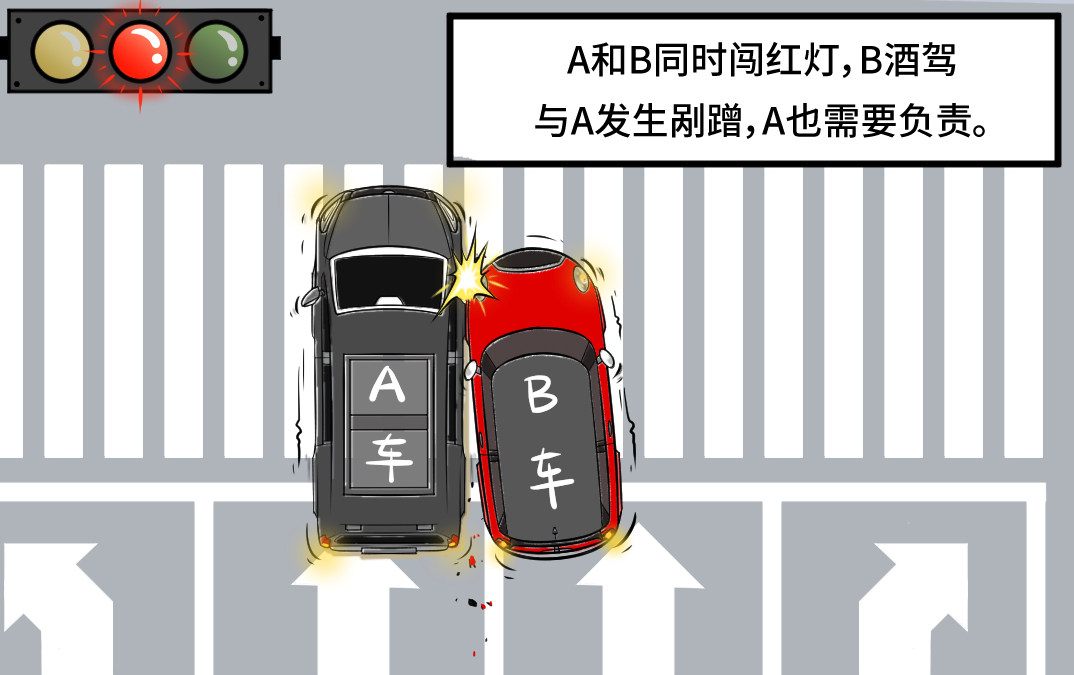 2. A和B同时闯红灯,B酒驾与A发生剐蹭,A也需要负责。