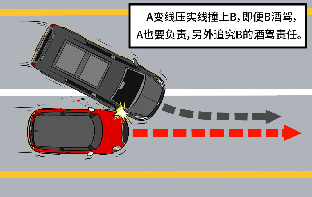 3. A变线压实线撞上B,即便B酒驾,A也要负责,另外追究B的酒驾责任。