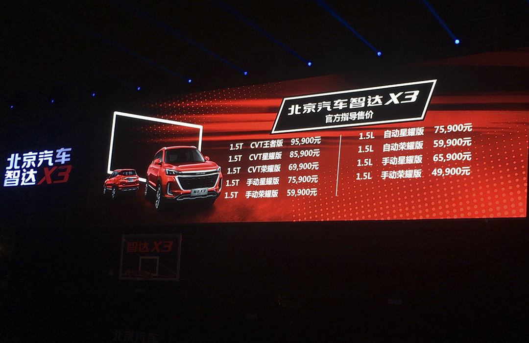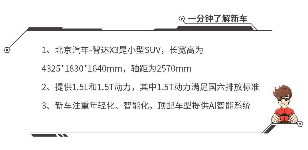 2019年7月26日,北京汽车智达X3正式上市,售价为4.99-9.59万元,共推出两种排量共计9款车型;新车定位为小型SUV,是北京汽车智系列的第三款车型,目标人群会是年轻气盛的青年。而为了博取年轻消费者的欢心,智达X3无论在颜值、智能方面,还是动力方面都下了不少功夫。