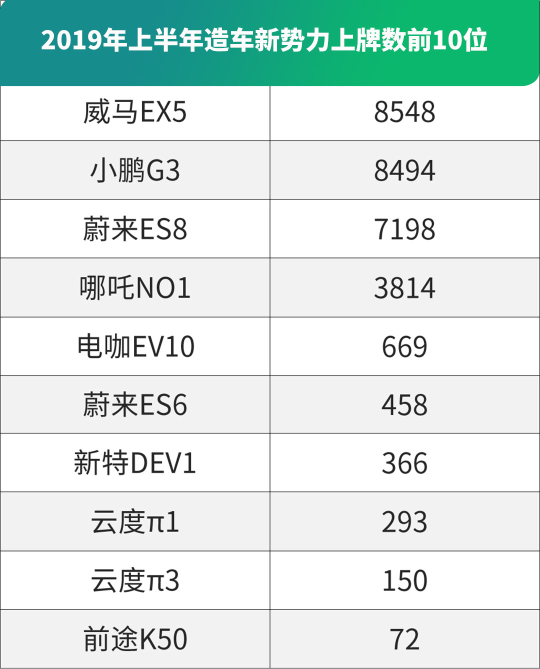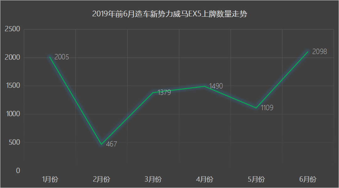 值得注意的是,在造车型势力2019年前6月交强险上牌量排名的前十的车型中,威马EX5累计交强险上牌量达8548辆,位居造车新势力第一,后来居上的小鹏汽车则以8494辆的上牌数量位居第二位,但已经有两款车型上市的蔚来汽车的总上牌数只有7656辆,只能屈居于第三位。