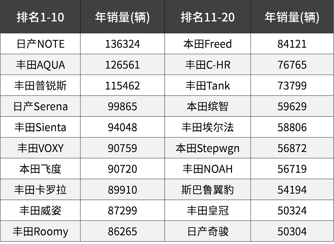 首先我们看看日本人最喜欢买的车都有哪些,以2018年销量为例,日本全年的汽车总销量超过500万辆,排名前十的,我们很多人都不大认识,最畅销的是日产一款叫Note的小型车,不属于K-car,跟飞度是同一个等级,年销量近13万。