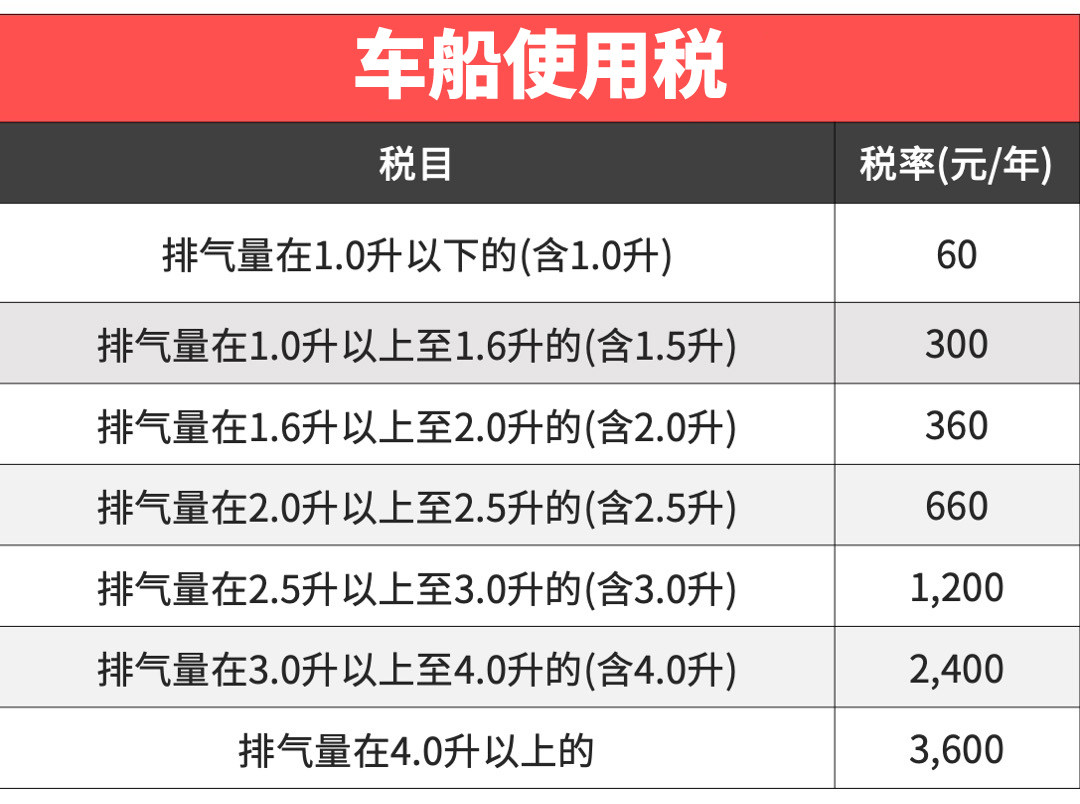 车船使用税:根据排量征收,乘用车领域,广东为例,排量1.0L以下到4.0L以上的区间为60元—3600元,市售车型绝大多数是2.0—2.5L的区间,也就是660元。