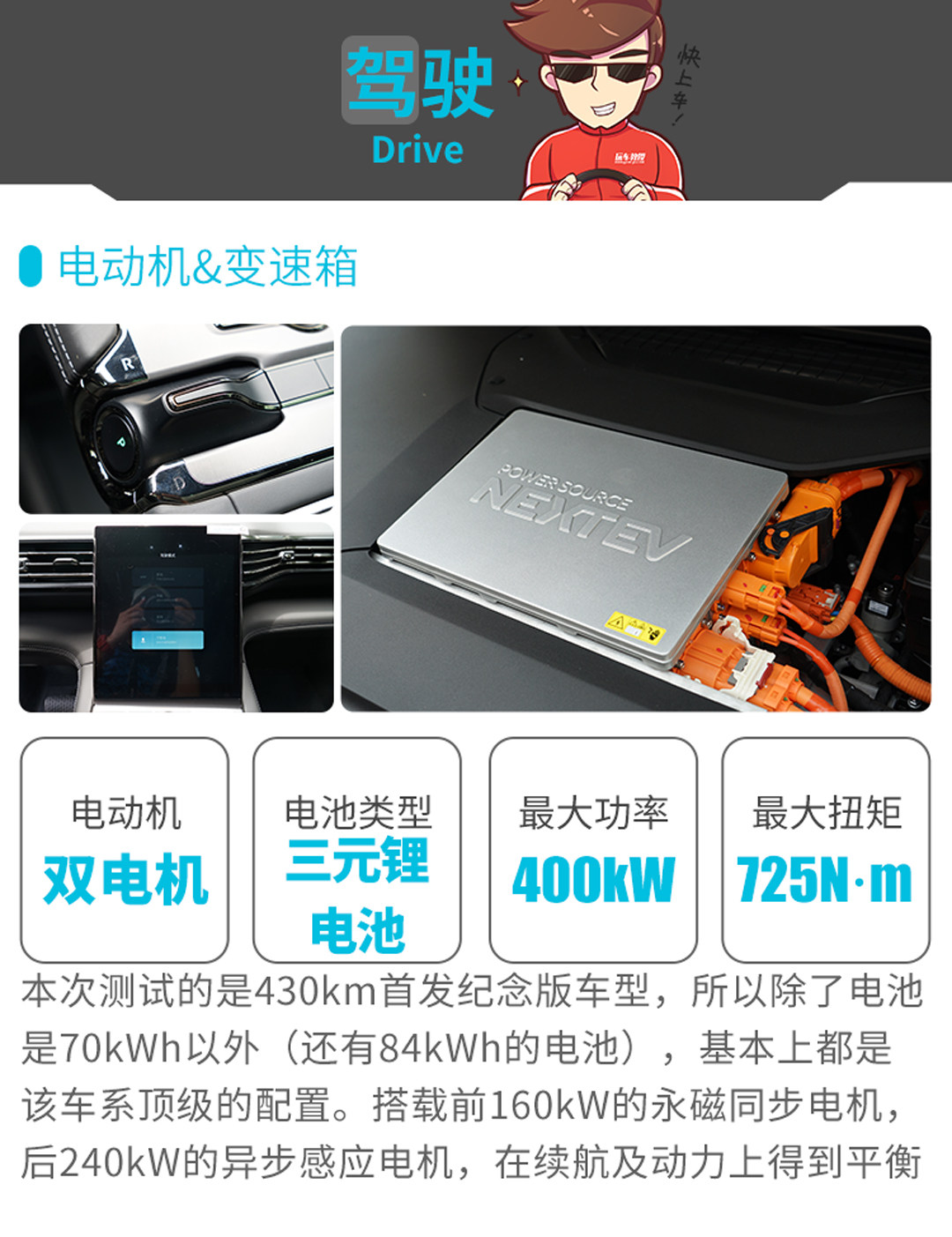 ES6官方宣称百公里加速4.7秒,可能由于天气或者个别车况原因,本次测试仅获得5.0秒的成绩,但是这样的成绩已经足够在同级别对手中排在前列,整体加速过程不算特别迅猛,相比起燃油车的后段发力,电动车起步即获得最大加速能力的方式可能需要适应,由于没有变速箱,所以加速过程并没有同等数据的燃油车那么大刺激感。