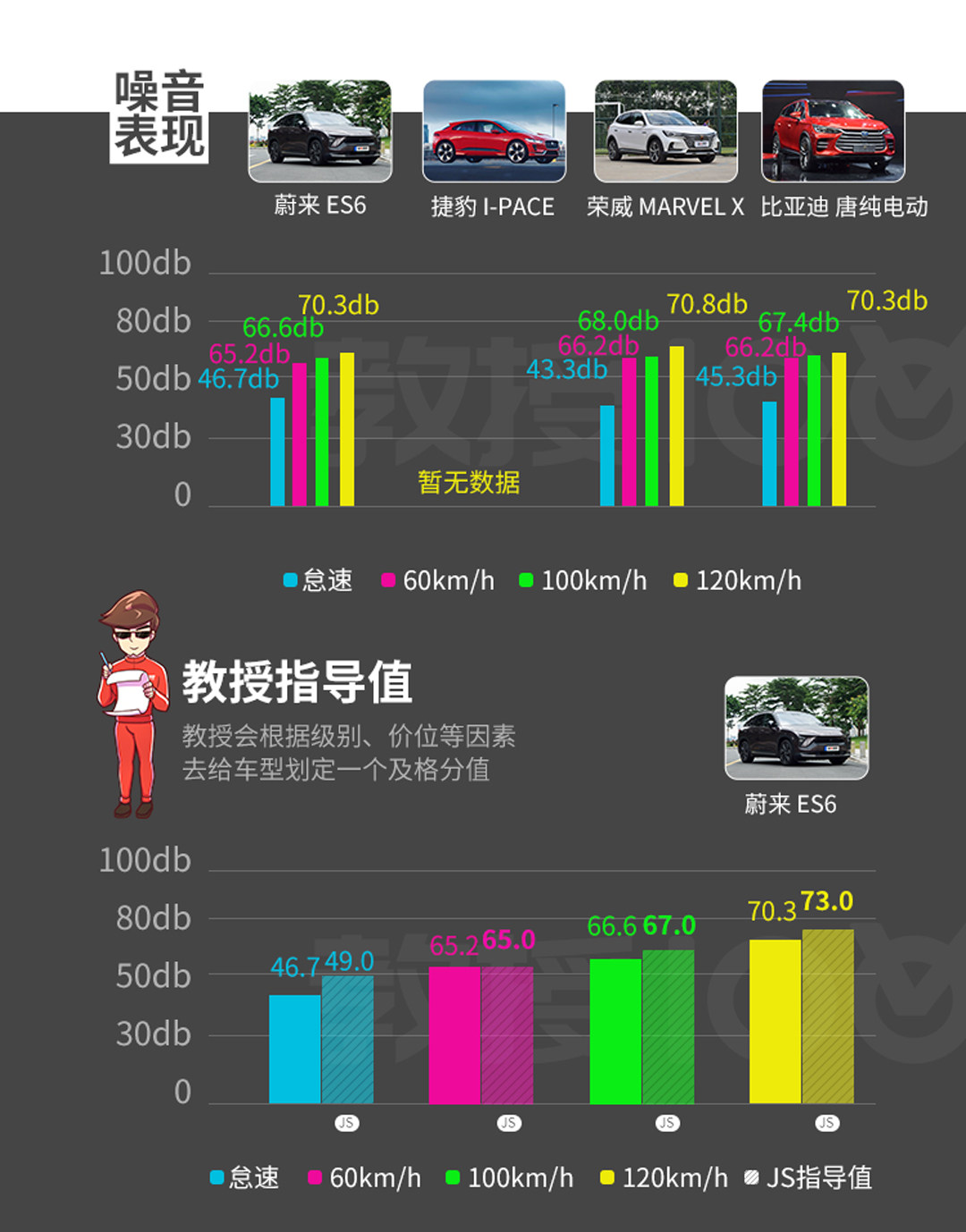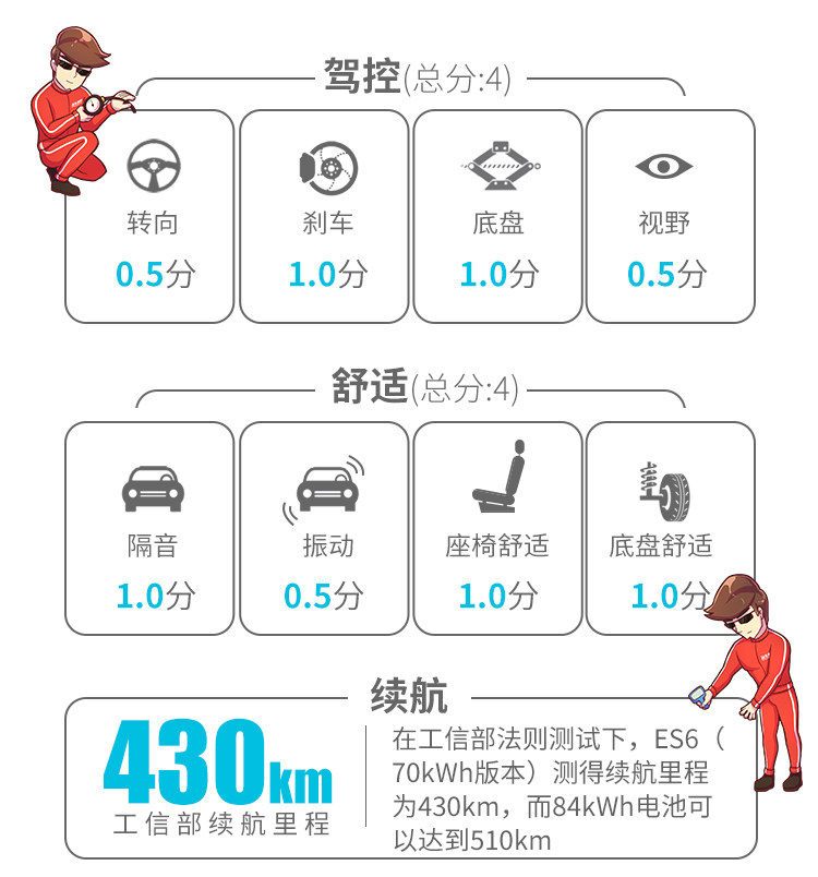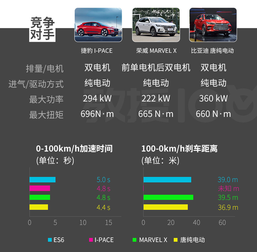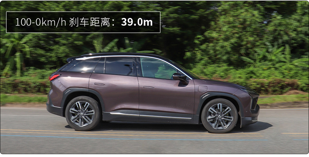 马牌MC6轮胎配合上四活塞卡钳,可以让ES6以最快速度,最短距离停下,但是由于当时的路况不算特别优秀,不能达到官方宣称的33米出头成绩,只获得39米的100-0km/h刹车距离,但是对于一台如此重的电动车来说,39米的成绩也是属于优秀范围,只不过跟性能车还是有差距。