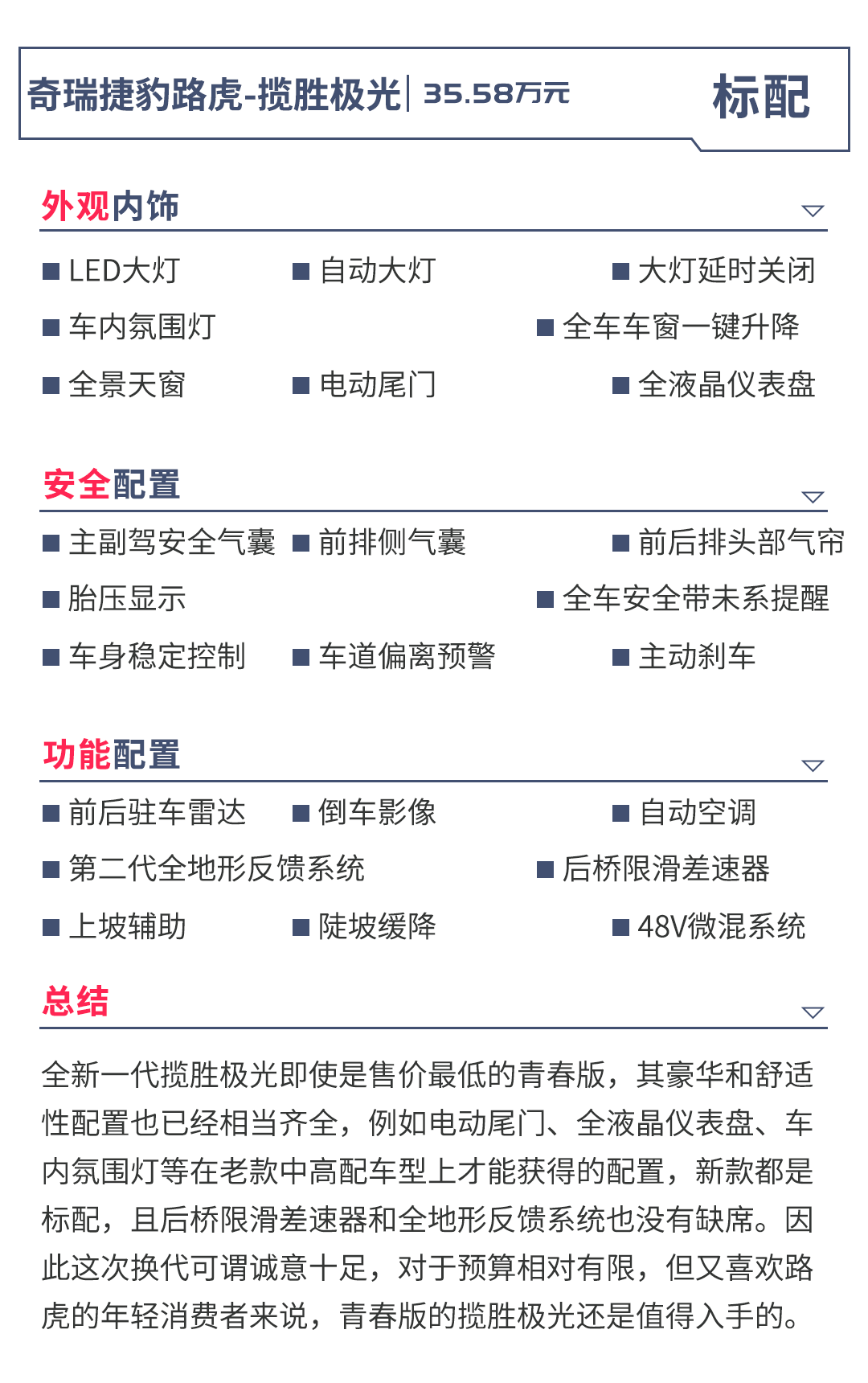 全新一代揽胜极光可谓是一款卖点突出、个性鲜明的豪华SUV,与同价位的BBA竞品车型相比,揽胜极光并不企图在尺寸和乘坐空间大小上与之一较高下,而是错位竞争,把心思更多用在了个性化的设计以及较强的越野配置和性能这两个方面。相信借着上一代车型的受欢迎程度,全新一代揽胜极光未来的市场表现必定相当乐观,而喜欢它但又感觉略超预算的朋友也不着急,先等几个月,之后必定会有一定程度的终端优惠,到时候就是出手的好时机!