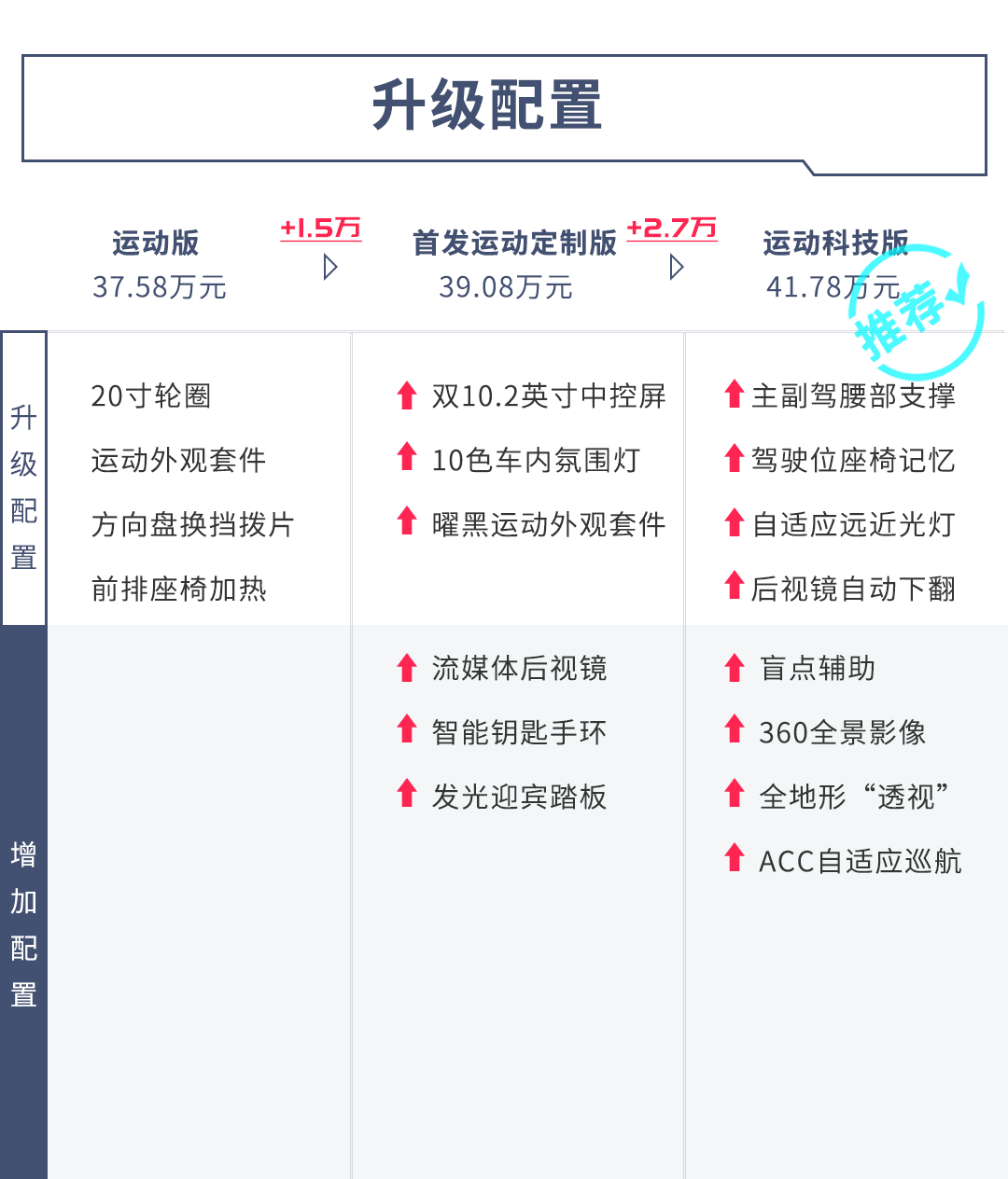 全系最值得购买的当属售价41.78万的运动科技版,其原因并不在于内饰的那一堆豪华或舒适性配置,而是它可以免费选装安全控(智能驾驶辅助包)升级包,这个升级包包括 360度全景影像、全地形“透视“技术,以及带方向修正功能的ACC自适应巡航。你没听错,是免费!我想买运动科技版的消费者没人会不选装!