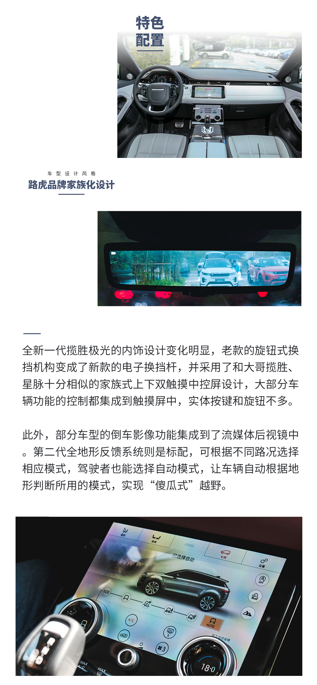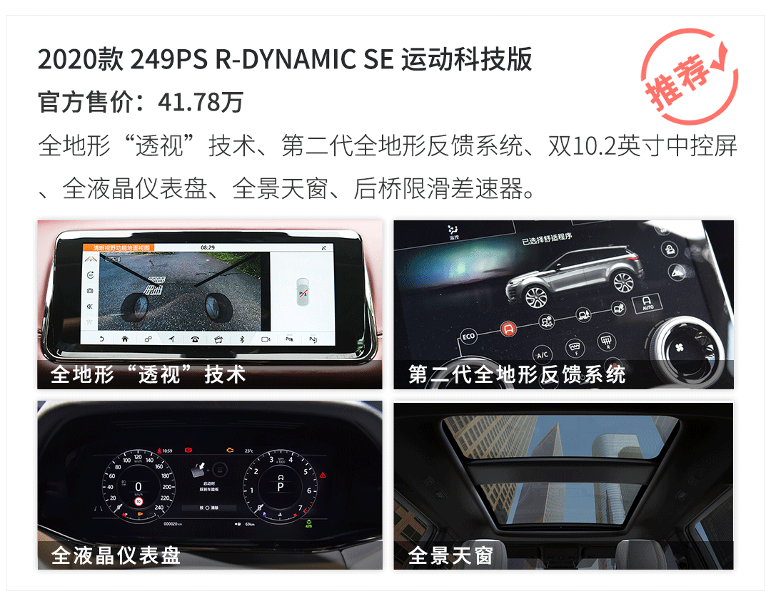 不过需要注意的是,揽胜极光本质上还是一台使用承载式车身,也就是没有大梁的豪华城市SUV,而不是使用非承载式车身也就是带大梁的硬派越野车,加之采用横置前驱为基础的适时四驱架构,不带有越野低速分动箱,还采用了大尺寸轮毂和低扁平比轮胎,前后杠的接近角和离去角不算大,因此它就算有着全地形反馈系统,也只能偶尔应付中低难度的越野路况,遇到高难度越野路面不要轻易挑战,城市柏油路面或乡村土路才是这款车最终的归宿。