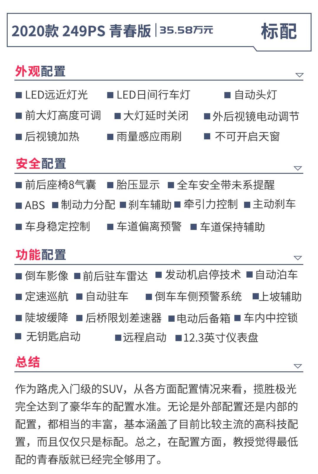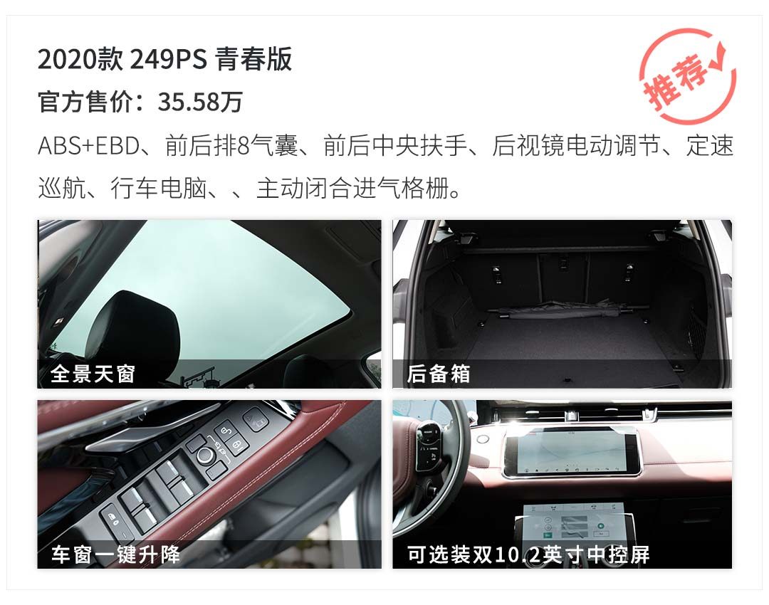路虎揽胜极光作为一款豪华型的SUV,标配的配置已经完全够用,而对于它配置的升级或者是增加,只是突出了更多的豪华感而已,并没带来太多驾驶上的改变。教授作为一个实用主义至上的老司机,很显然选择青春版已经足够。当然,如果还想要一些自己想要的配置,选装即可,毕竟顶配有的配置几乎都可以选装,除了少了一个运动外观的套件。