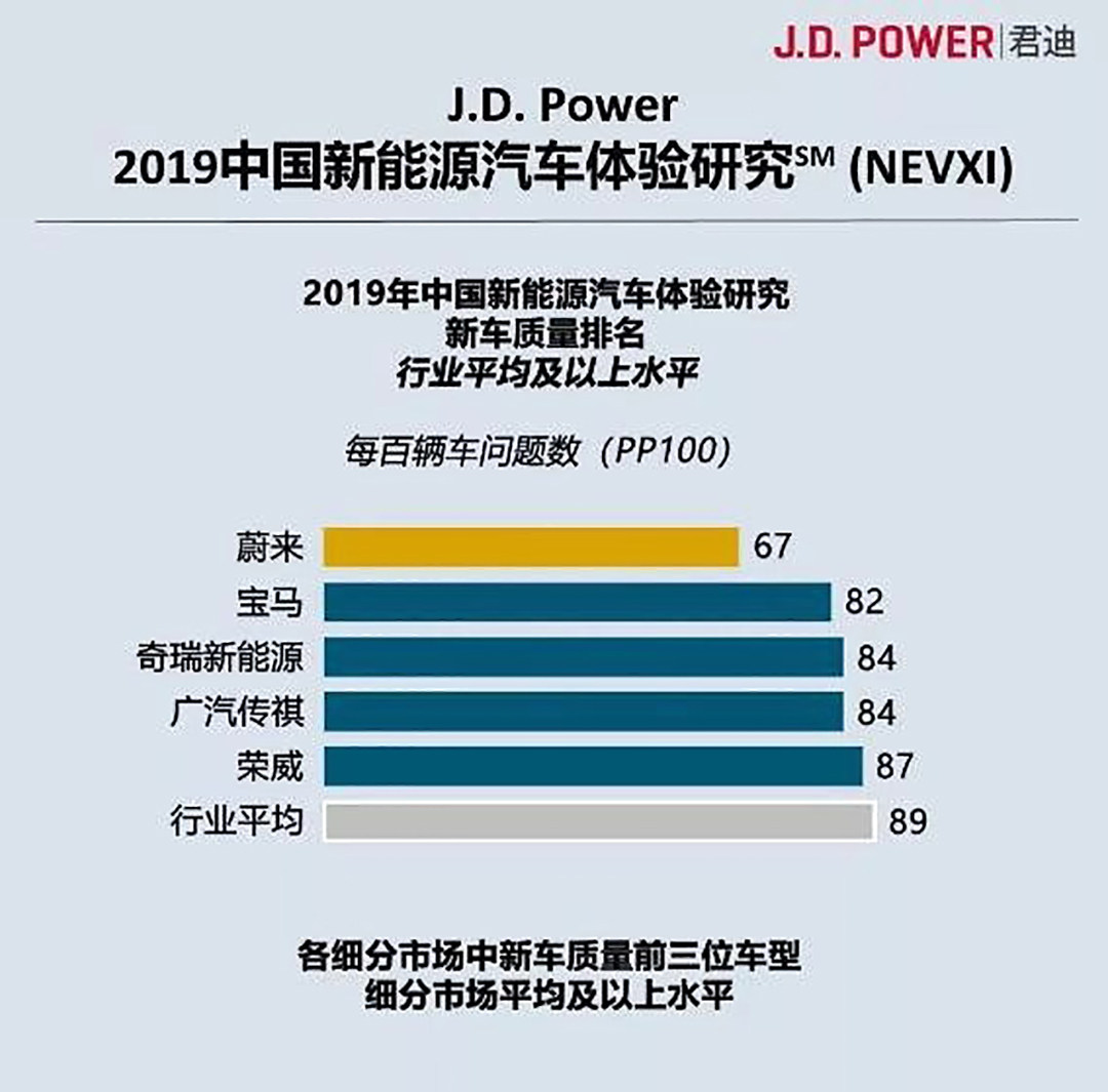 日前,J.D.Power公布了《2019中国新能源汽车体验研究》,从排名看到蔚来问题数最少排在第一位,紧跟随后为宝马、奇瑞新能源,广汽传祺和荣威也存在行业平均水平之上。榜单中仅有蔚来属于新势力造车,其余均为传统车企,其他新势力造车情况榜单没有提及。J.D.Power为业内权威的评测机构,不过近年来其在中国市场公布的榜单备受争议,导致公信力下降。
