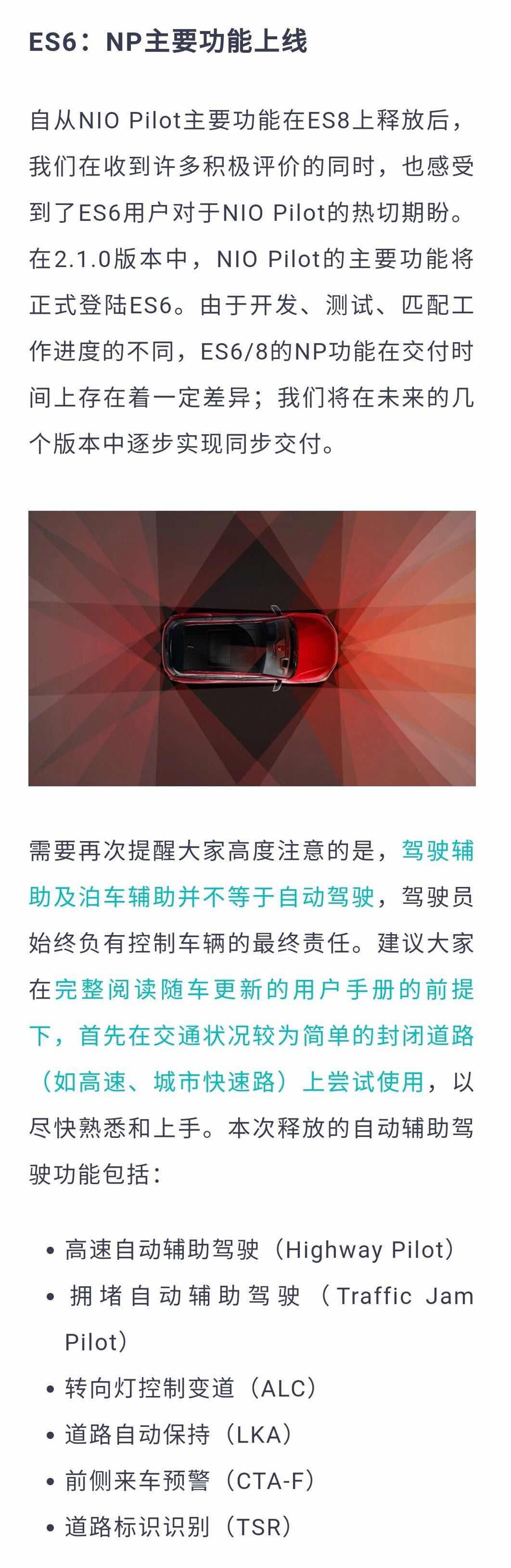 另一厢,在经历过此轮更新后,蔚来NP的主要功能在ES6身上将正式上线。此次释放的NP功能主要包括高速自动辅助驾驶、拥堵自动辅助驾驶、转向灯控制变道、道路自动保持、前侧来车预警、道路标识识别等。