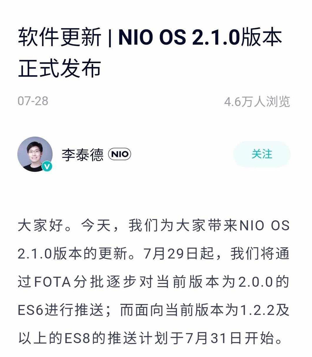 根据蔚来的推送消息显示,从7月29日起,蔚来将通过FOTA分批逐步对当前NIO Pilot 版本为2.0.0的ES6进行推送更新,7月31日开始,对当前NIO Pilot版本为1.2.2及以上的ES8进行推送更新。