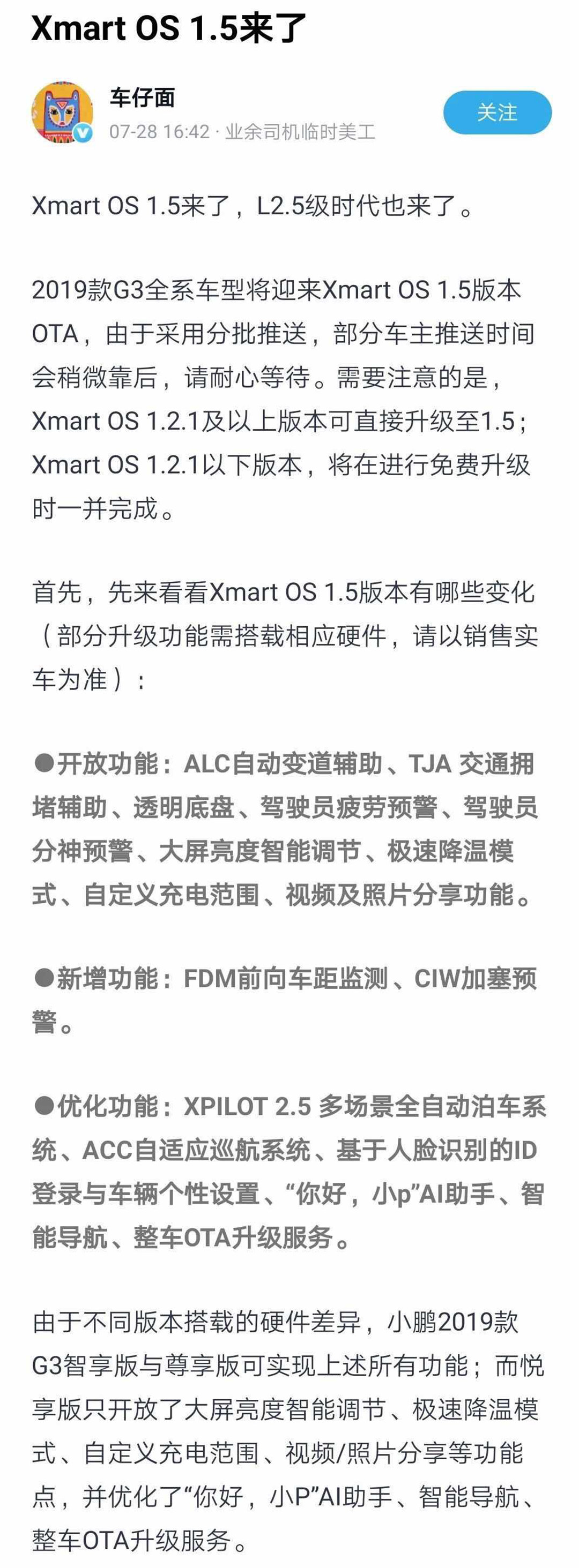 2019.7.29,小鹏汽车官宣:2019款小鹏G3全系车型将分批迎来Xmart OS 1.5版本OTA升级软件。届时,Xmart OS 1.2.1及以上版本可直接升级至1.5版本,而1.2.1以下的版本,将在进行免费升级时一并完成。