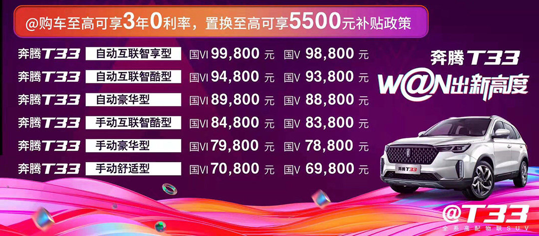 8月3日,一汽奔腾T33正式上市,新车共提供6种配置两种排放标准共12款车型,售价为6.98-9.98万元。