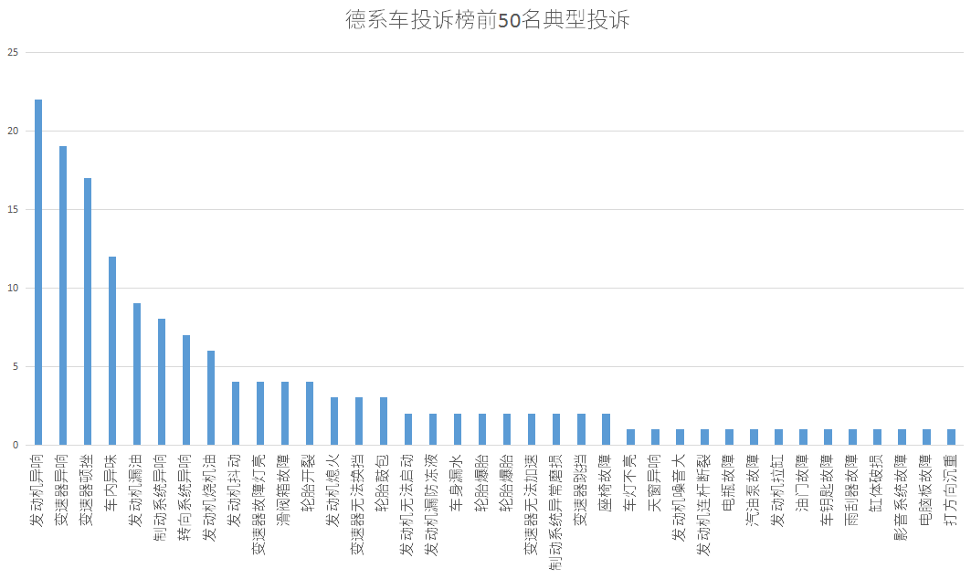 在德系车投诉榜前50名中,共有22款车被投诉发动机异响,19款车被投诉变速箱异响,17款车被投诉变速箱顿挫,显然普遍采用涡轮增压发动机和双离合变速箱的德系车型在动力系统方面不够让消费者满意,除此之外德系车还容易出现的问题则是发动机漏油以及车内异味、转向、制动系统异响等问题。