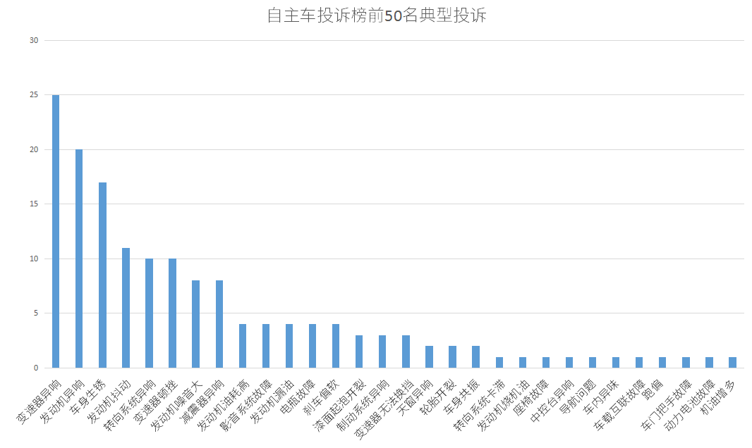 作为性价比最突出的自主车,它的投诉其实也不算多了,车身生锈和动力系统异响抖动是消费者主要吐槽的地方,此外减震异响、变速箱顿挫、漆面起泡、车身共振等问题也备受吐槽,自主车型虽然投诉不算多,但是问题的分布还是比较广泛的,电子系统、车身、制动和动力系统均有少量投诉。