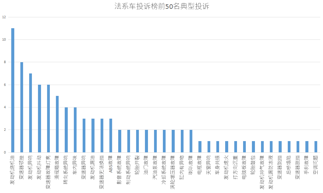 目前市场份额最小的法系车反而被投诉最多的是发动机烧机油的问题,其次则是动力系统的异响和抖动,而ABS故障、影音系统故障、涡轮增压器故障等故障问题也被投诉得较多,甚至还有缸内有异物这样的投诉,可见法系车确实是天马行空啊。