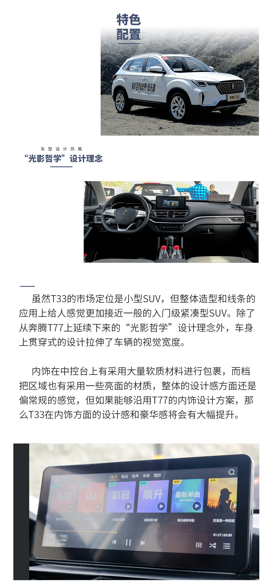 奔腾T77在上市时,凭借着颜值极高的外观设计以及出色的车辆配置表现为自身带来了极高的市场人气。而在T77打开市场后,奔腾T33也紧随其后,加入了SUV市场的竞争当中。