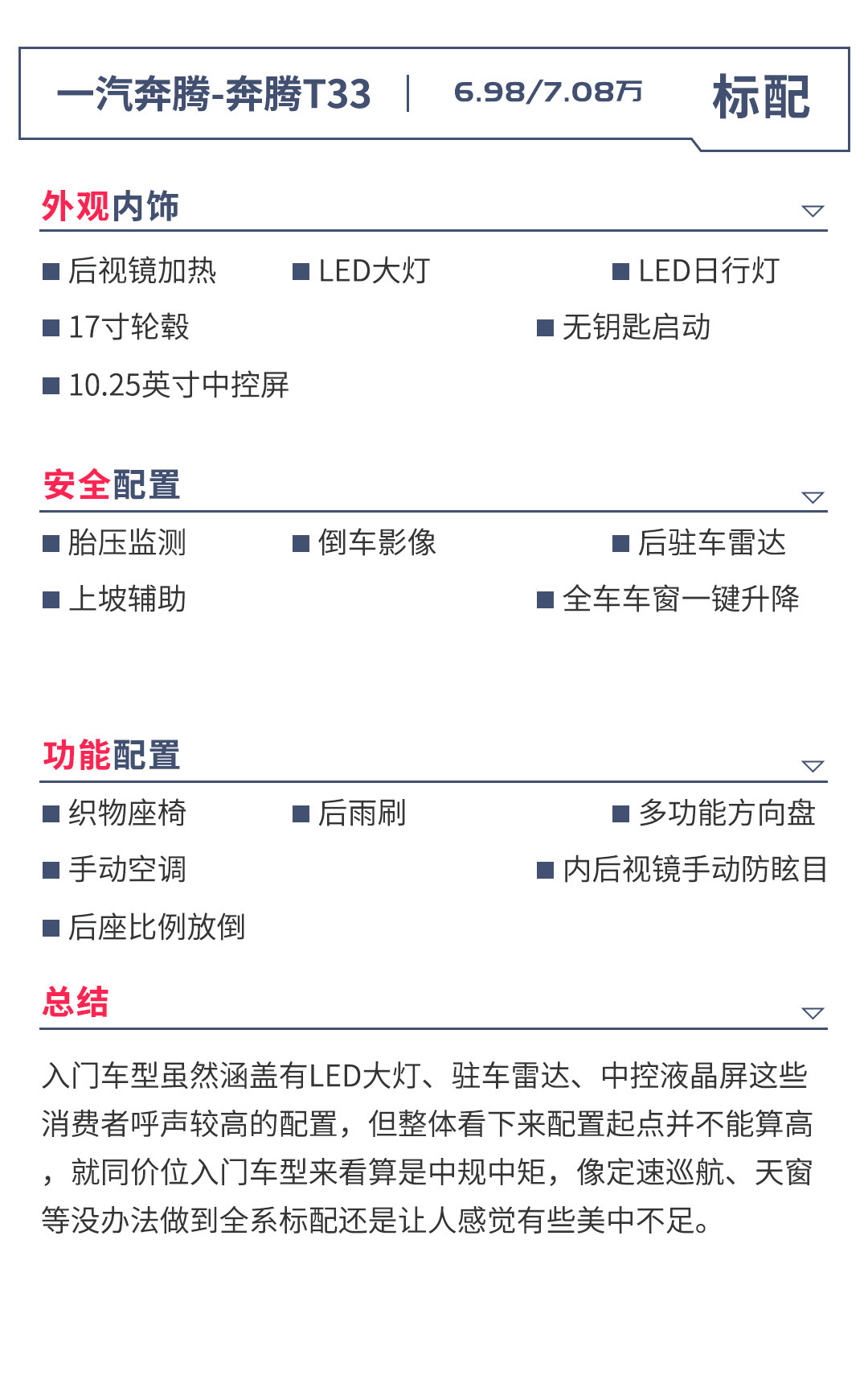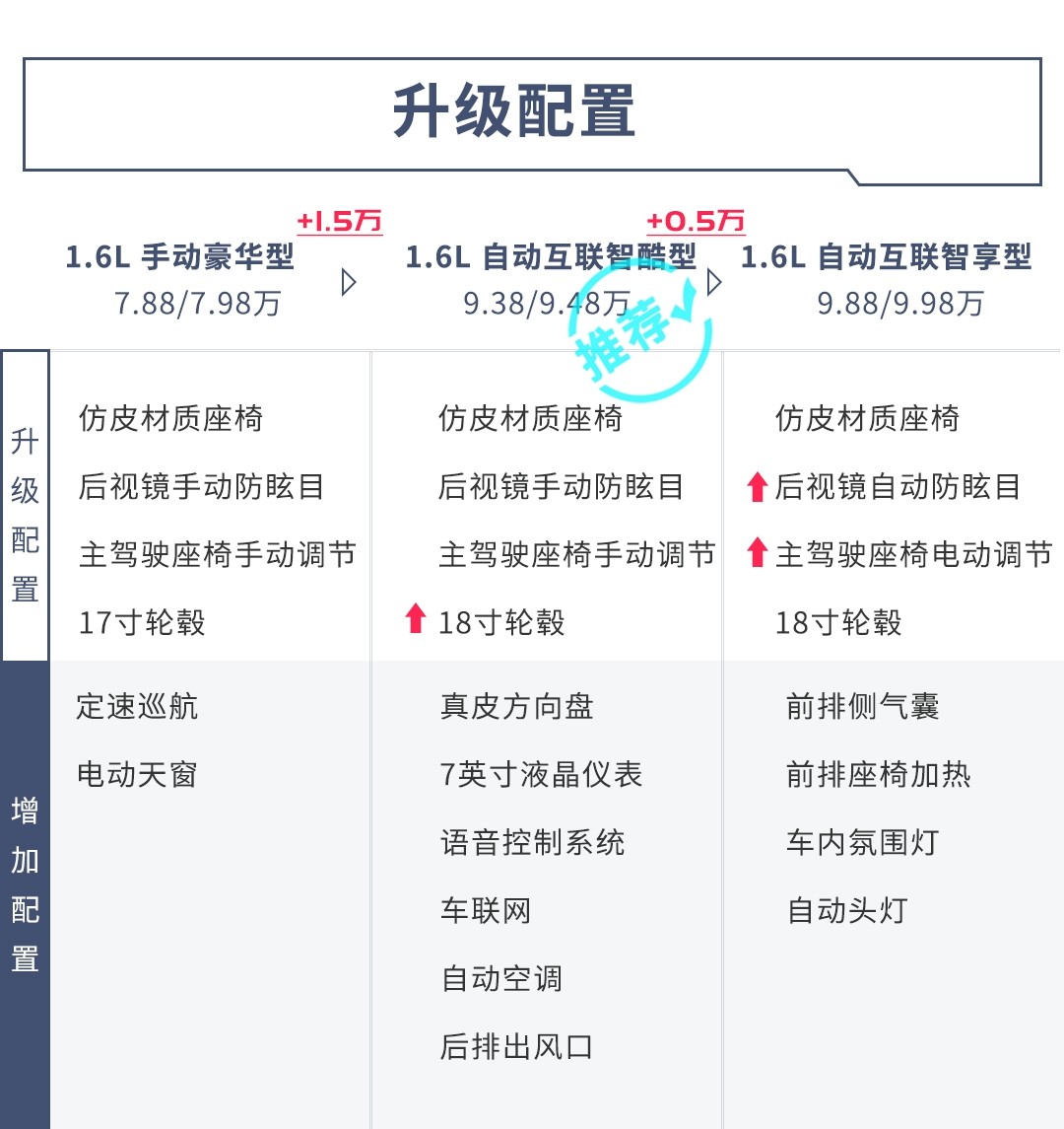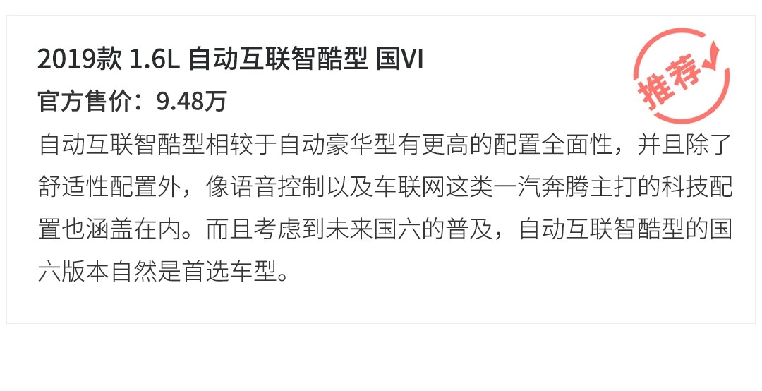 从配置方面来看,奔腾T33官方主推车型应该是互联智酷型以及互联智享型,而其中,互联智酷型的手动版和自动版配置维持了统一的水准,两个版本仅变速箱的区别,而自动互联智享型则在智酷型的基础上做了进一步的配置优化。