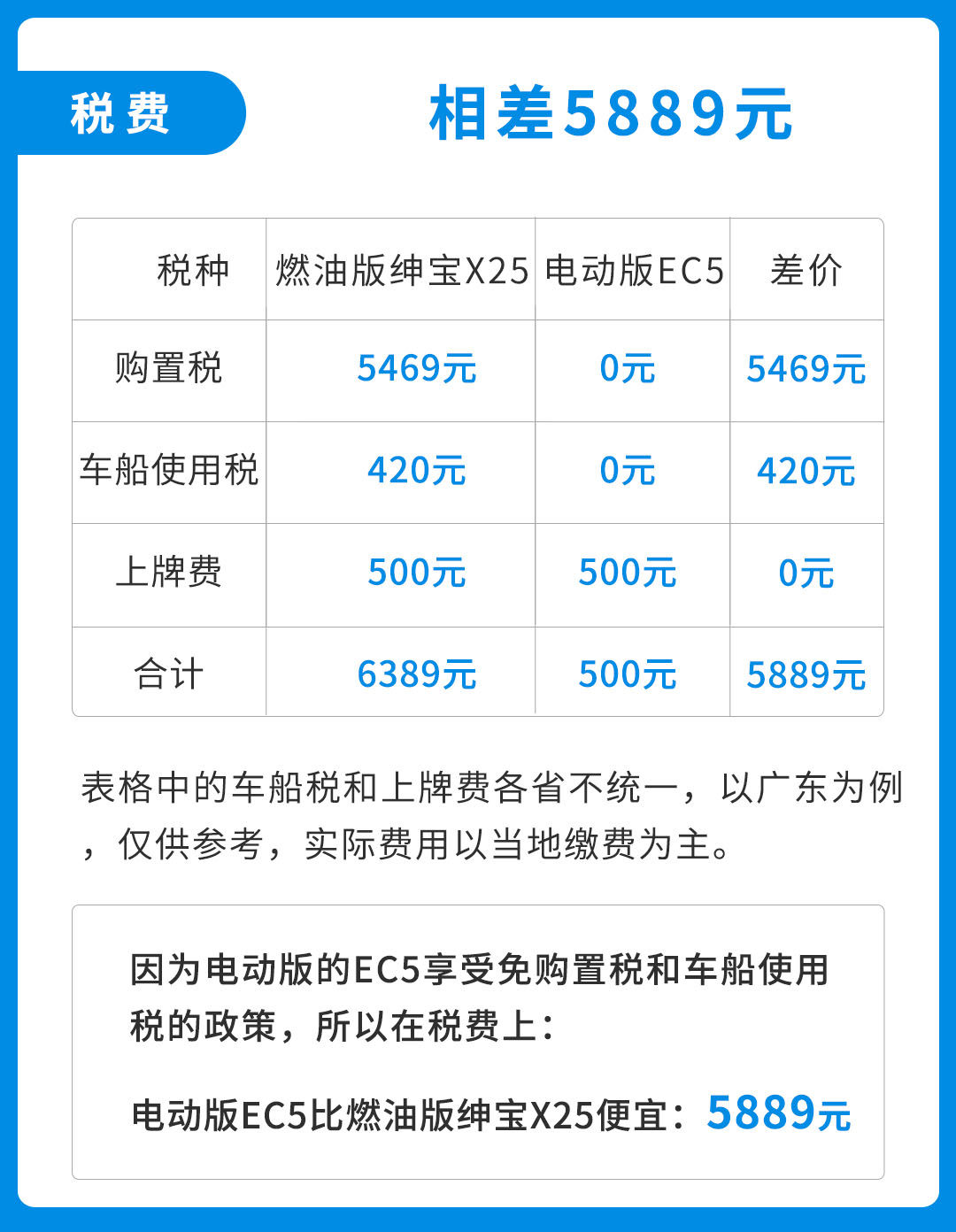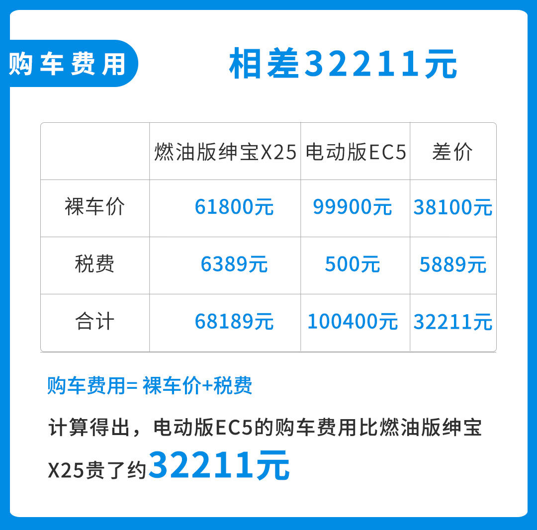 综上来看,电动版EC5虽然在裸车价上比燃油版绅宝X25贵38100元,但前者相比后者少了购置税和车船使用税共计5889元。所以从前期的购车费用来看,电动版EC5比燃油版实际贵了32211元。
