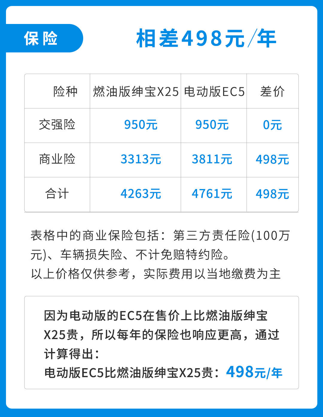 保险费用包括交强险和商业险,因为两车均为家用6座以下车型,因此强险均为950元/年。而商业险方面,因为售价不同,所以费用也不一样,在选择相同的险种之后,电动版EC5商业保险为3811/年,燃油版绅宝X25为3313元/年。所以在保险费用上,电动版比燃油版每年贵约498元。