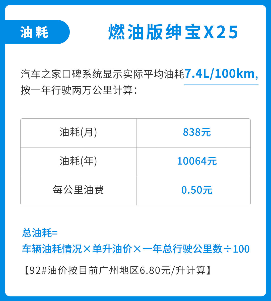 接着我们再来看燃油版绅宝X25,其官方百公里油耗为6.8L,汽车之家口碑显示实际平均油耗约为7.4L/100km。油价虽然分地区和周期性变化,但变化幅度不会太大,以目前广东地区92号汽油6.8元/L来算,绅宝X25每公里油费约为0.50元。