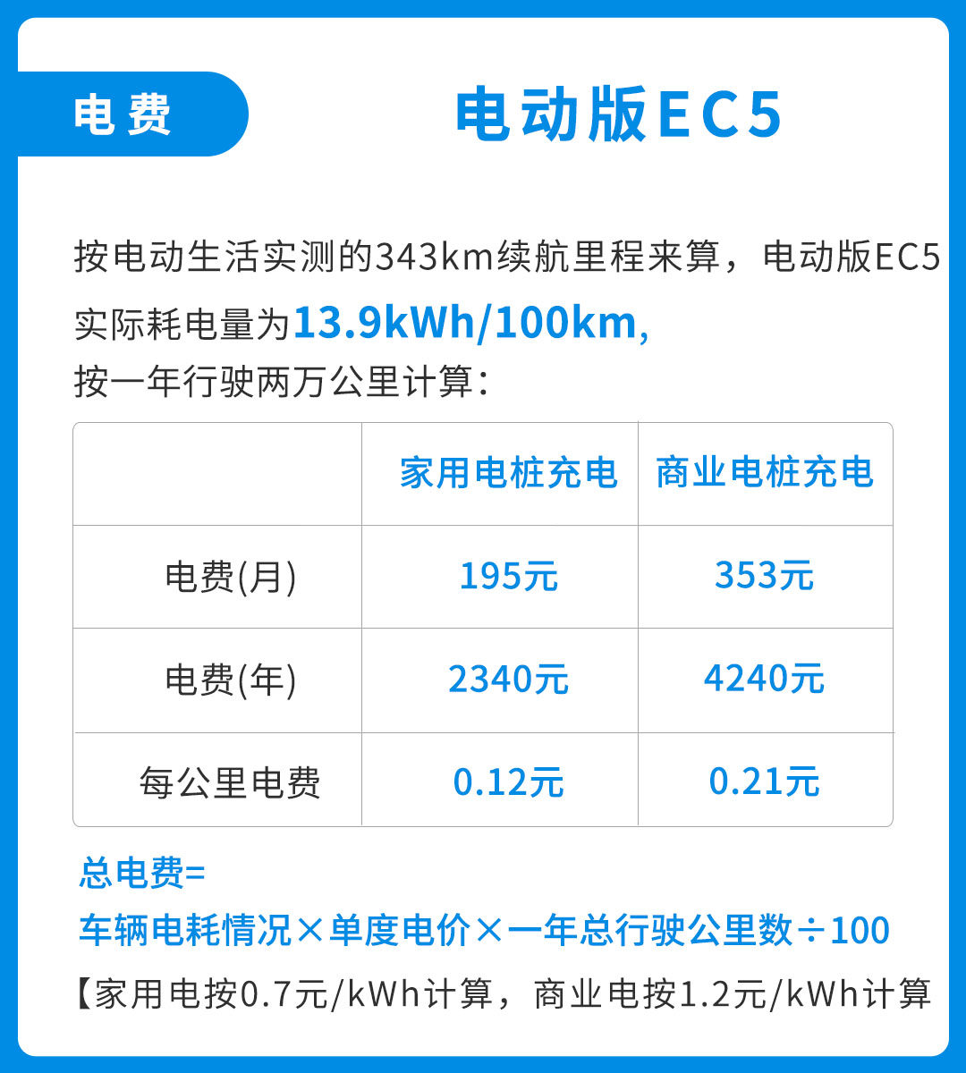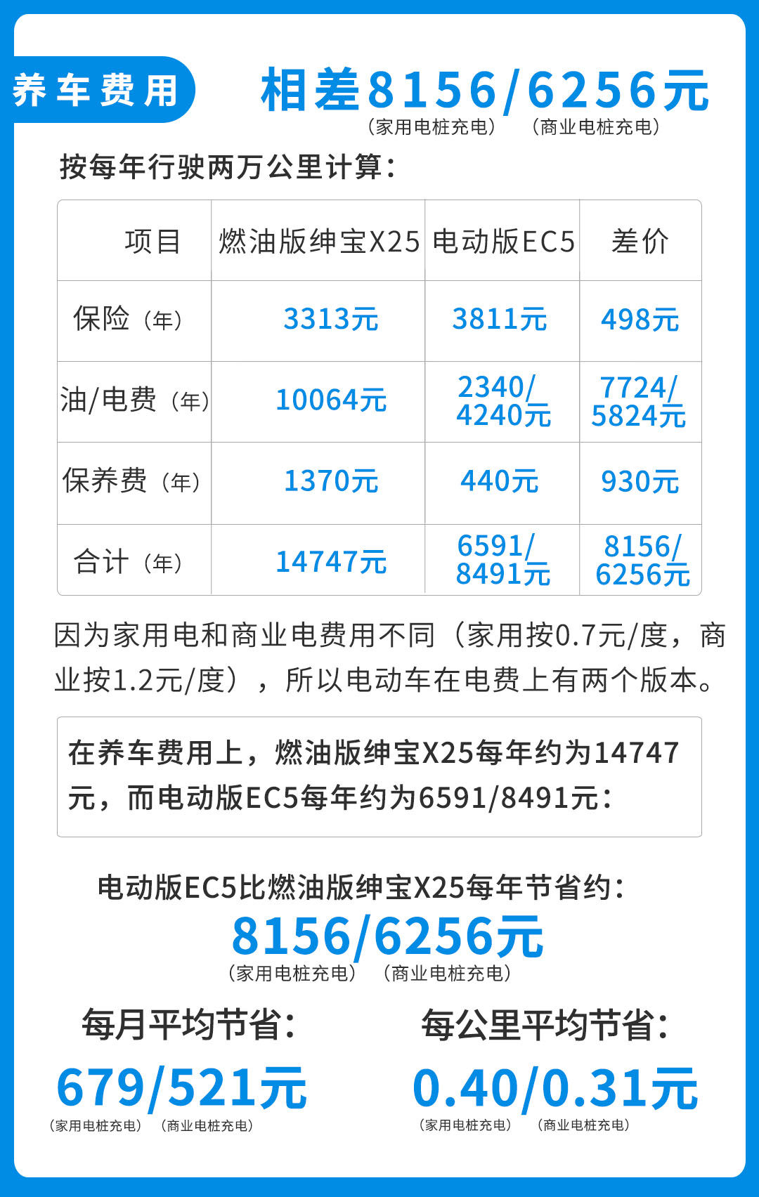 因为在购车价上,电动版EC5比燃油版绅宝X25贵了约32211元,按照前者比后者在养车费用上每年节省8156元(家用电桩充电)/6256元(商业电桩充电)来计算,差不多4年或者5年的时间,电动版EC5就能抹平与燃油版绅宝X2在购车价上的价差了。