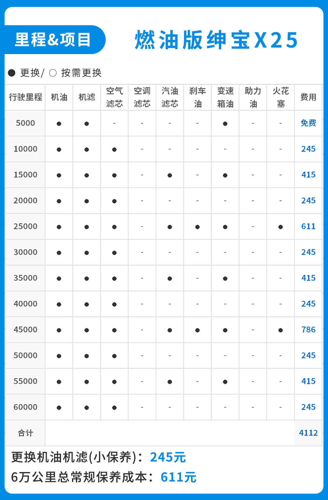 相比于燃油版绅宝X25,电动版的EC5保养就相对简单,不需要更换机油、三滤等,一般情况下只需要进行常规的检查维护,每一万公里保养一次,每次大概220元。而汽油版的绅宝X25大概每6个月或5000公里保养一次,其中首保免费,小保养包括更换机油机滤,价格约245元;大保养价格约611元。