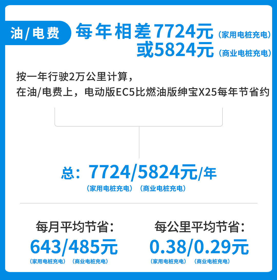 如果按照1年行驶2万公里来计算,那么电动版EC5比燃油版绅宝X25每年节省约7724元(家用电桩充电)或5824元(商业电桩充电)。(当然有细心的网友会说,加油站经常会有优惠活动,针对会员还有不同的优惠政策。但电费也分阶梯式电价和高峰、低谷电价,所以本文就不做这类的细分。)
