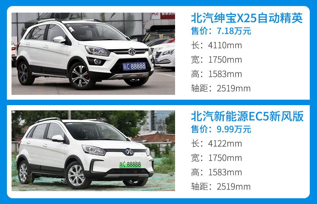 为了尽量避免因品牌、车型、车身尺寸和配置等方面造成的价格差异,我们选择了北汽绅宝X25 2017款1.5L自动精英导航版(以下简称燃油版绅宝X25)和北汽新能源EC5 2019款新风版(以下简称电动版EC5)为例,两款车拥有相近的尺寸和配置,所以参考意义更大。