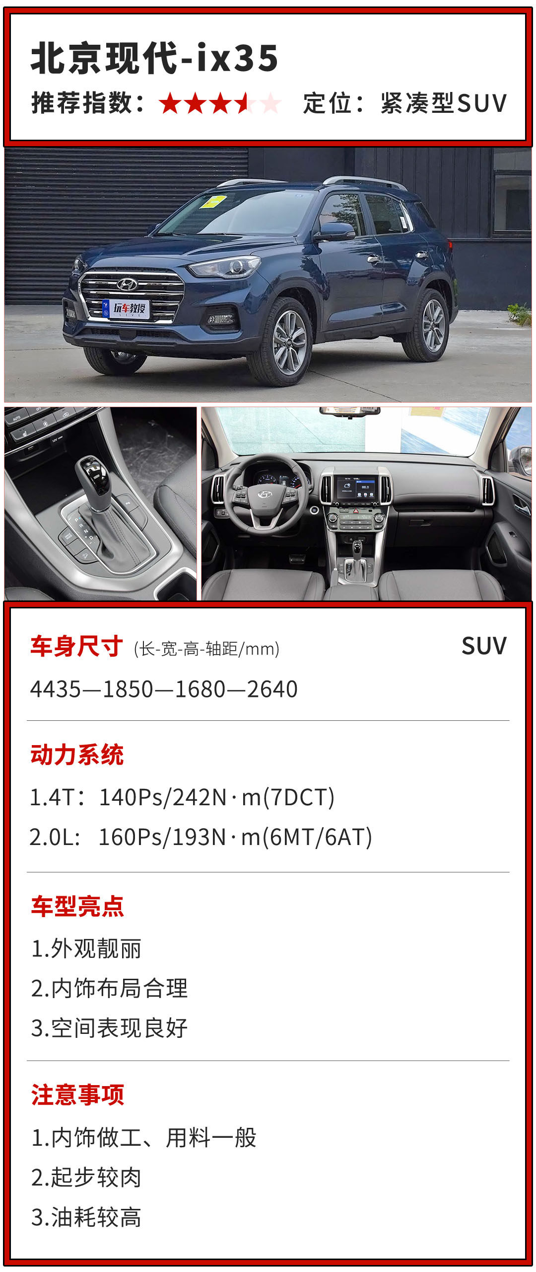 一般来讲,合资车的保值率都会比自主品牌高上一些,但是就现代ix35的表现来看,却是一个例外。而至于现代ix35为什么销量会表现不错呢?教授认为,大部分原因应该在于它的价格优势上。相信在消费者渐渐趋于理性的时候,不会被价格所吸引,现代ix35销量也会下降到普通的水准(落榜)。从保值率上看的出来,现代ix35在二手市场的表现并不怎么好,小毛病频出,年份越久毛病越多。对于这样的一款车型,教授一般不建议购买,当然,如果有换代改款,还得看它产品力的具体表现。