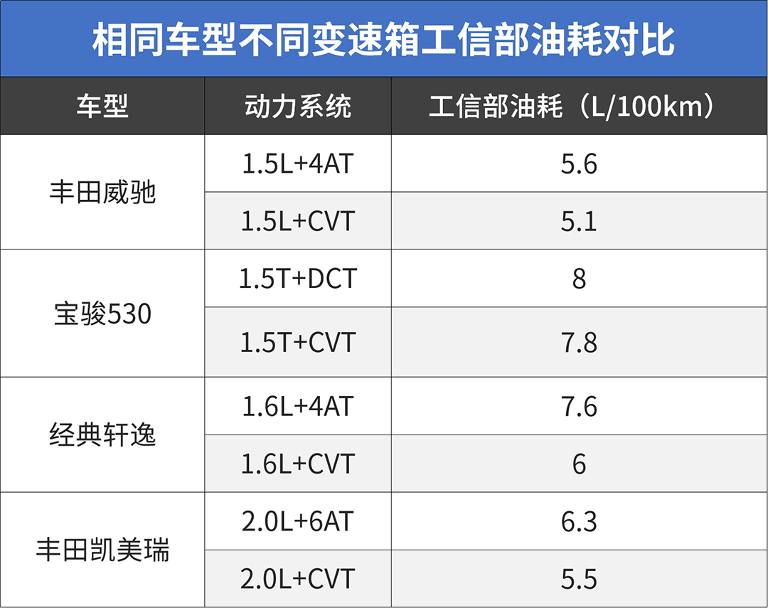 至少在巡航时,更低的转速也意味着更加低的油耗,虽然CVT的传动效率不高,但是在日常使用中油耗确实是比较出色的。这一点从许多车型换上CVT之后的工信部油耗数据也能看出来。比如说笔者的威驰在换上CVT之后工信部油耗下降了0.5L/100km,要知道本身威驰这款车型就很省油。