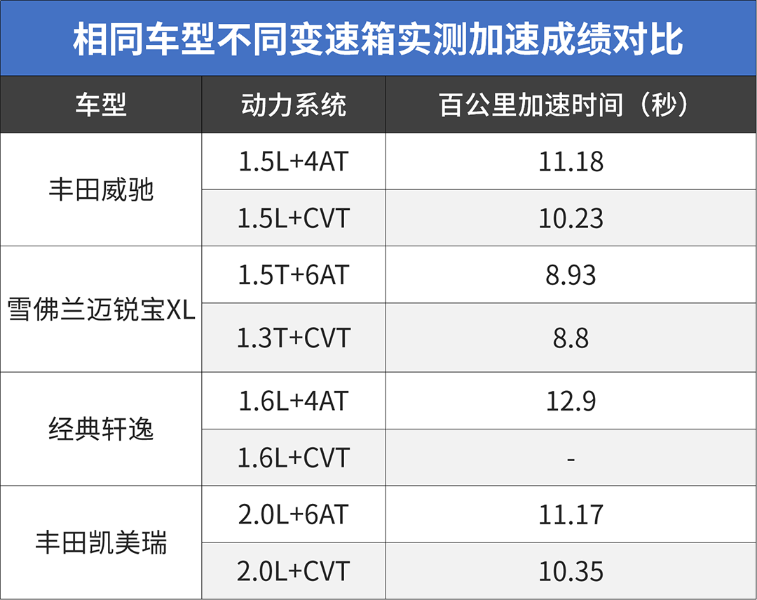 由于CVT变速箱连续变速的工作特性,在实际加速中CVT的加速实力要比AT变速箱更加好,还是以笔者的丰田威驰为例,这一代威驰改款前使用的1.5L+4AT变速箱,改款后把4AT变速箱换成了CVT变速箱,就这一个改动,在实际测试中CVT车型加速就能快出1秒的时间。要知道CVT可还是有起步保护的。