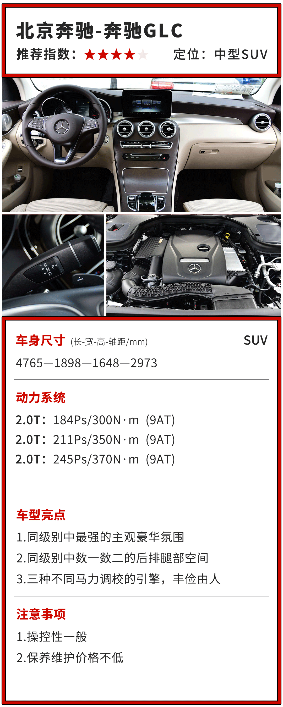 推荐豪华品牌怎么能不说奔驰,推荐三五十万的奔驰又怎能不说GLC。奔驰GLC无论是从哪个角度看,都可谓是这个价位豪华5座SUV的首选。首先是设计,从这一代S级开始下放的奔驰家族式设计语言让GLC的外观和内饰富有高级感的同时又十分耐看,即使距离最初亮相已有一定年头,GLC的豪华感和气场也毫不逊于那些才完成换代不久的对手。其次是空间,现款在售的GLC均为中国特供的长轴版,根据教授的实际体验来看,前后排能同时舒服坐下身高1米8体重200斤胖子的豪华品牌5座中型SUV并不多,而GLC则是其中表现最好的那一款车。