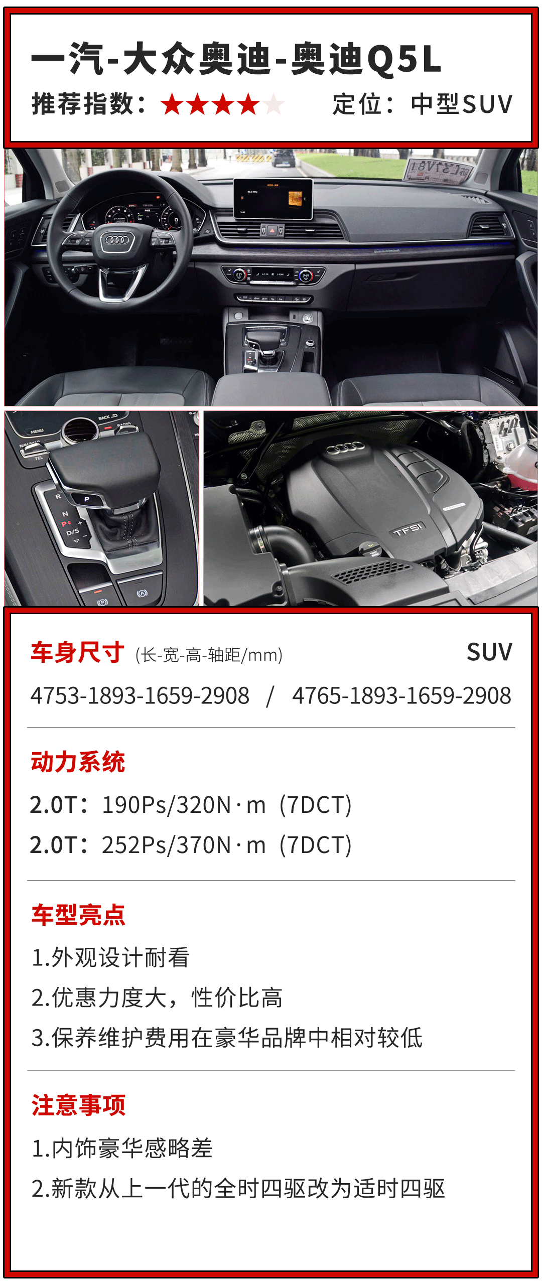 当然,既然是豪华品牌,那么奥迪在用料和做工上还是要比同集团的大众高级一些,并且全系标配了适时四驱,无论是舒适性还是动态驾驶乐趣,都要比同价位能买到的大众途昂要好不少,加上Q5L一贯有着不错的优惠力度,你还能说它性价比不高吗?