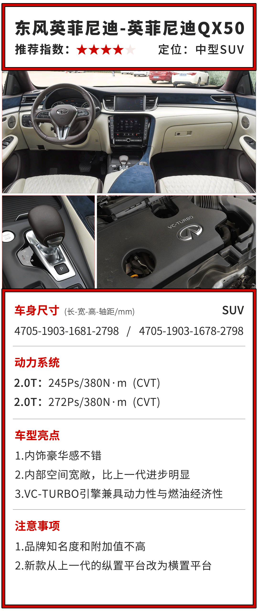 QX50这款车在产品力层面其实并不存在什么短板和硬伤,它之所以小众,很大程度还是因为英菲尼迪的品牌附加值和知名度不够高,大部分不太懂车的人可能还压根认不出这是一台什么牌子的车。不过,既然你能够喜欢并选择QX50,那就证明你是真爱粉,是真正懂车识货有品味的人,别人的目光和看法根本不会对你的购车行为产生影响。