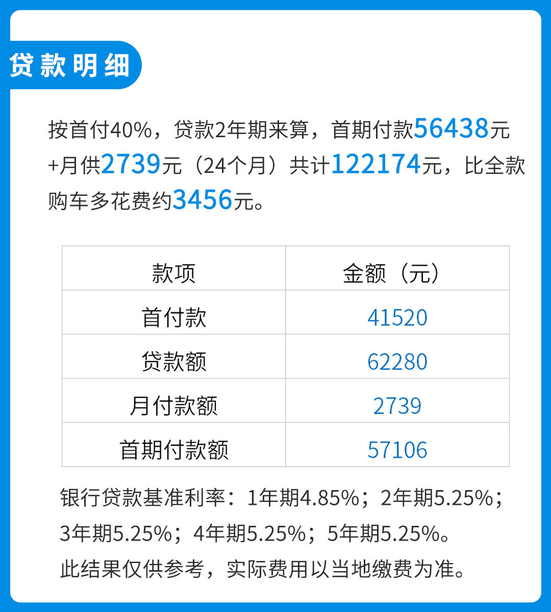 如果你的腰包不足,需要贷款买车,按首付40%,贷款2年期来算,需首期付款56438元+月供2739元(24个月)共计122174元,比全款购车多花费约3456元(有些地方贷款需收取一定手续费,视地区而定,买车时先了解清楚,以免入坑)。