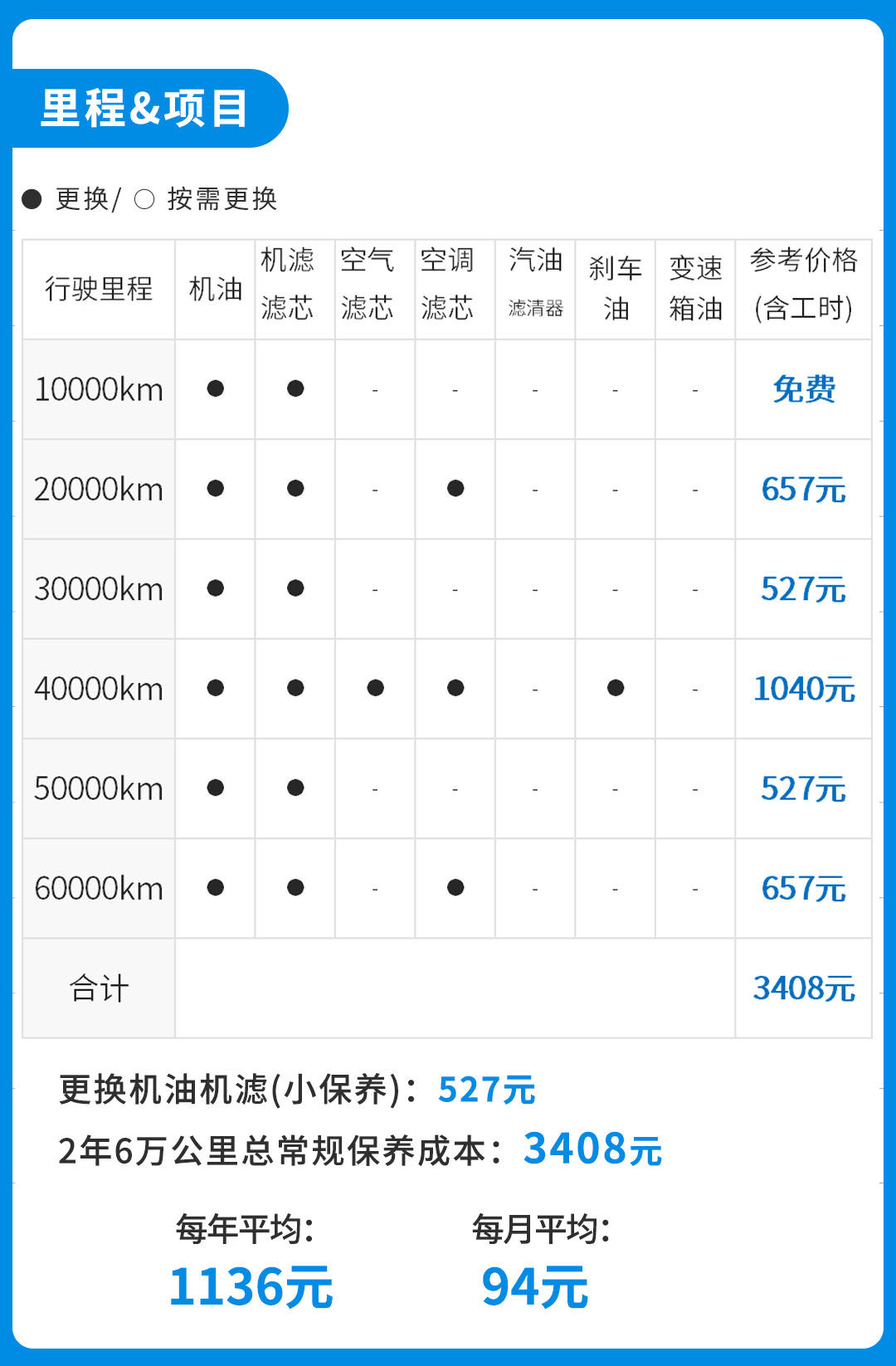 按照3年6万公里的行驶里程来算,三年的总保养费用约为3408元,每年平均花费1136,每月平均花费不到100元,仅仅94块钱左右。