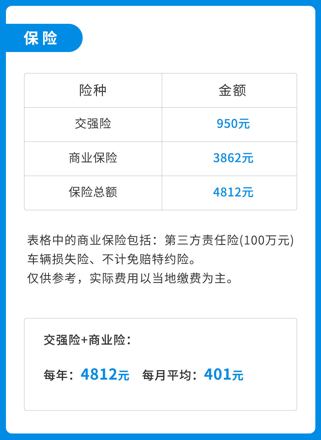 除了油费,保险费也是一笔不小的开支,交强险每年950元是跑不掉的。而至于商业险,可以选择性购买,但绝不要抱有侥幸心理而不买。你想啊!前段时间,某豪华品牌车主静静地停在路口等红灯都能被后车撞得车毁人亡,虽然那是小概率事件,但是在交通环境相当复杂的国内,磕磕碰碰在所难免。