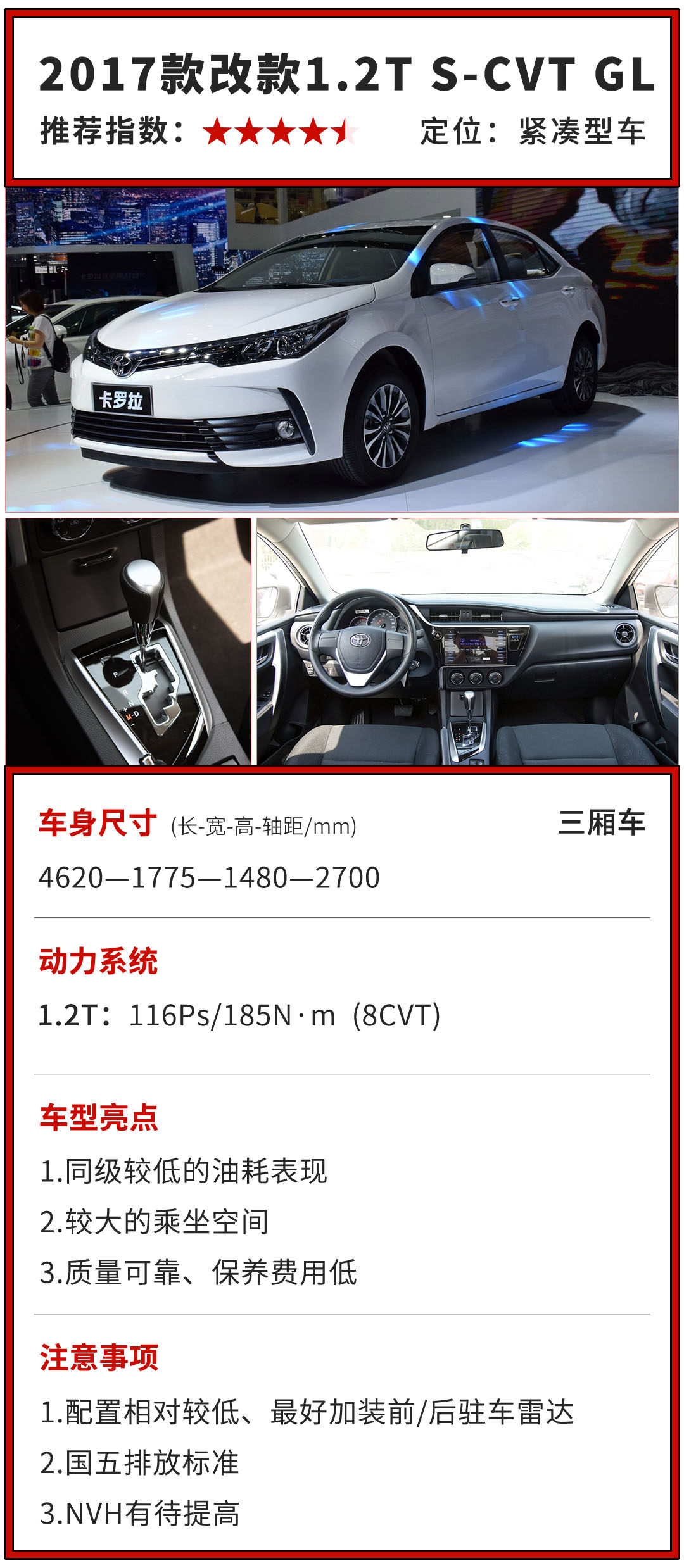 现款卡罗拉提供1.2T、1.6L、1.8双擎HEV和1.8L双擎E+PHEV四种动力共计21款车型。在这么多的车型里,教授推荐1.2T自动挡入门车型——2017款 改款 1.2T S-CVT GL版本,该车配置上虽然比较“清淡”,没有天窗,没有多媒体中控屏,座椅织物,甚至连前/后驻车雷达都没有,但贵在便宜,而且一些配置后期加装也不贵,或者和4S店销售磨磨嘴皮子,兴许还会有意外的惊喜赠送。